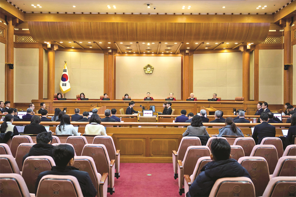2月11日,尹锡悦在韩国首尔宪法法院出席总统弹劾案庭审。韩国宪法法院11日举行总统弹劾案第七次正式辩论。4名证人围绕宣布紧急戒严的程序合法性、选举舞弊指称等问题当庭作证,中央选举管理委员会事务总长金龙彬否认国会选举存在舞弊嫌疑。