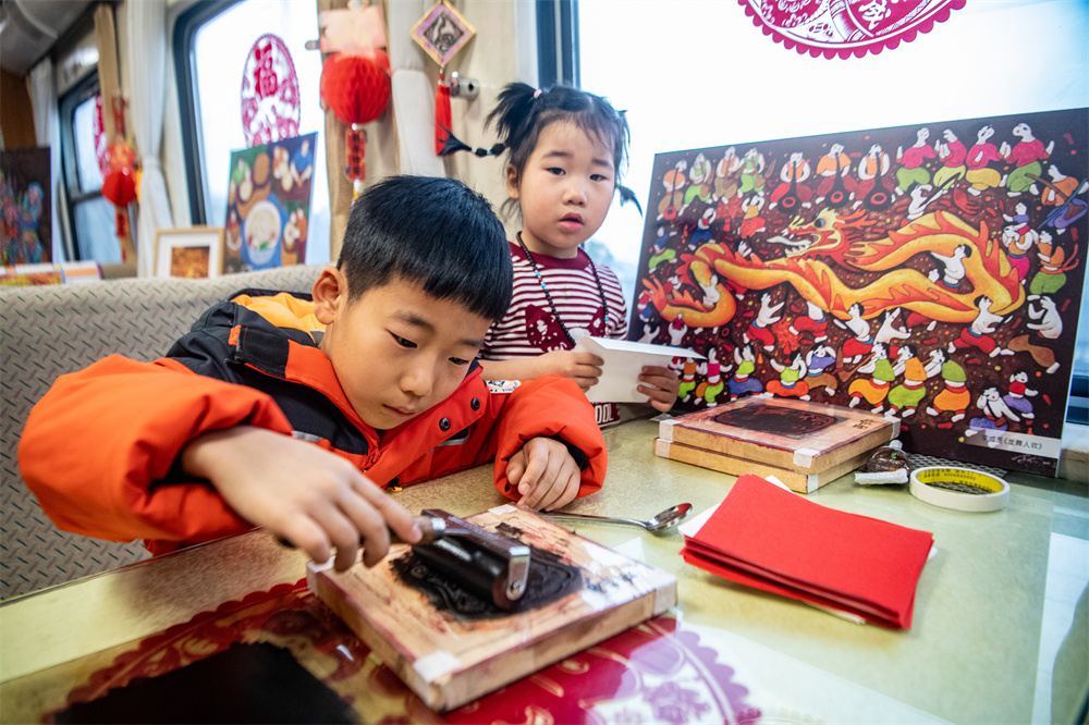 2月12日,小朋友在重庆开往北京的T10次列车上,体验制作綦江农民版画。