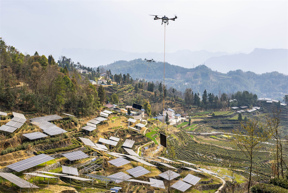2月13日,技术人员在湖北省宜昌市秭归县茅坪镇花果园村光伏电站建设现场用无人机吊装光伏板(无人机照片)。