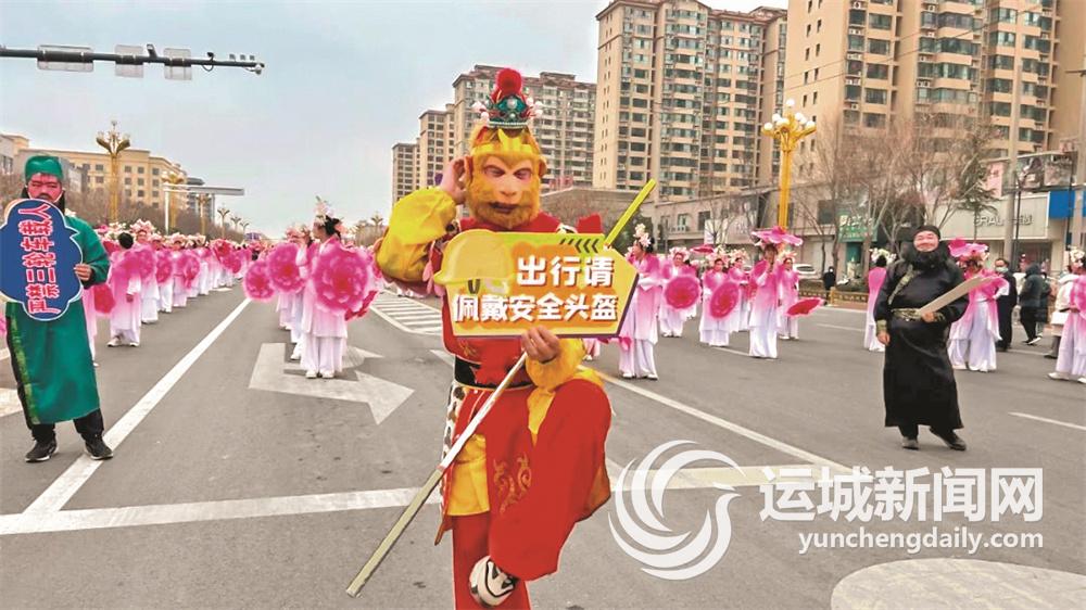 在万荣县城区主干道举行的社火活动中,万荣交警大队全体民辅警在全力保障内外围交通顺畅的同时,深入社火游演现场,与游演队伍同行,并邀请游演队伍中的“孙悟空”“刘关张”等表演者化身“交通安全宣传员”,共同传递安全理念。“戴上这头盔,俺老孙就是齐天大圣!”“俺老孙一个筋斗十万八千里,但开车可不能超速啊!”孙悟空的扮演者挥舞着金箍棒,幽默又亲切地提醒大家注意行车安全。舞狮队员们在舞动间隙用灵动的动作展示宣传牌子,向观众传递交通安全重要信息。“喝酒结义是豪情,安全才是真兄弟,酒后千万不要开车啊!”“刘关张”也向大家发出诚挚倡导。