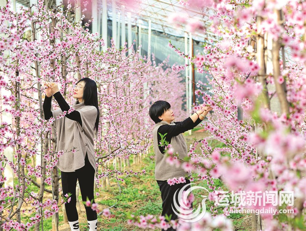 2月17日,万荣县德鑫源种植合作社一处大棚油蟠桃基地,村民们在疏花。