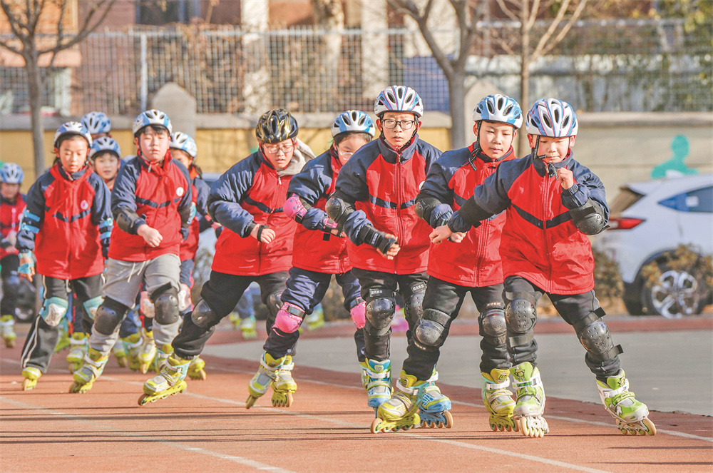 开启新学期后,河北省遵化市第六实验小学学生在体育课练习轮滑。新华社发(刘满仓 摄)
