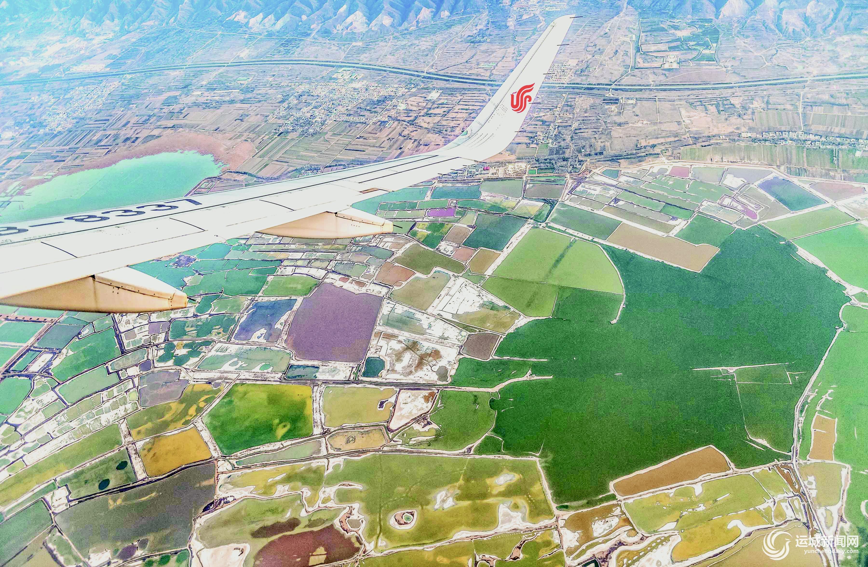▲近日,在乌鲁木齐至运城的航班上拍摄的七彩盐湖美景。