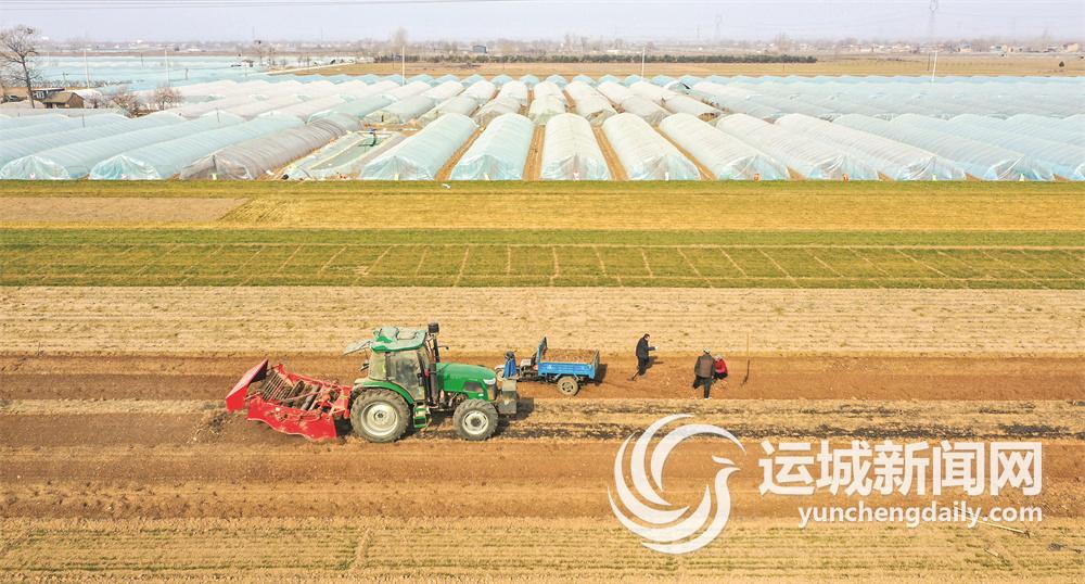 2月18日,夏县瑶峰镇周村农民驾驶农机在田间收获中药材。