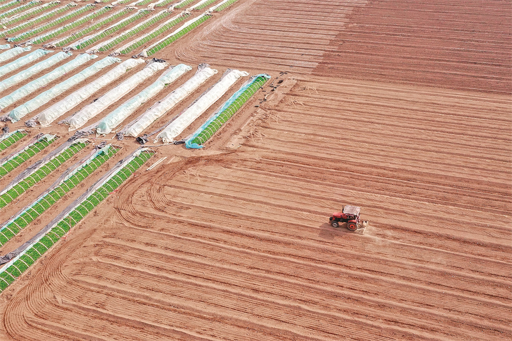 2月18日,在河南省沁阳市崇义镇南里村,农民驾驶农机在田间整地。新华社发(杨 帆 摄)