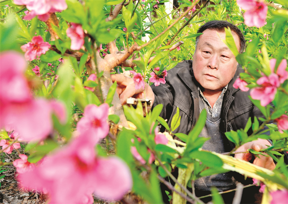2月18日,在河北省沧州市吴桥县于集镇孙庄村,农民在给油蟠桃树剪枝。新华社发(周 洋 摄)