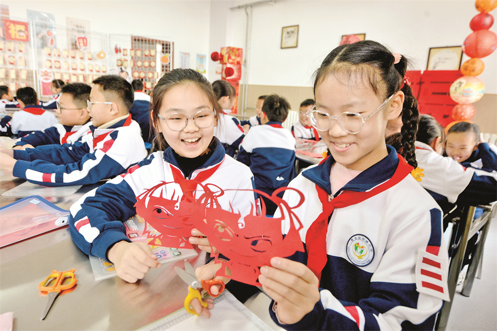 2月14日,两名学生在山东青岛宜阳路小学“传统文化润童心”主题活动中学习“哪吒”剪纸。新华社发(王海滨 摄)