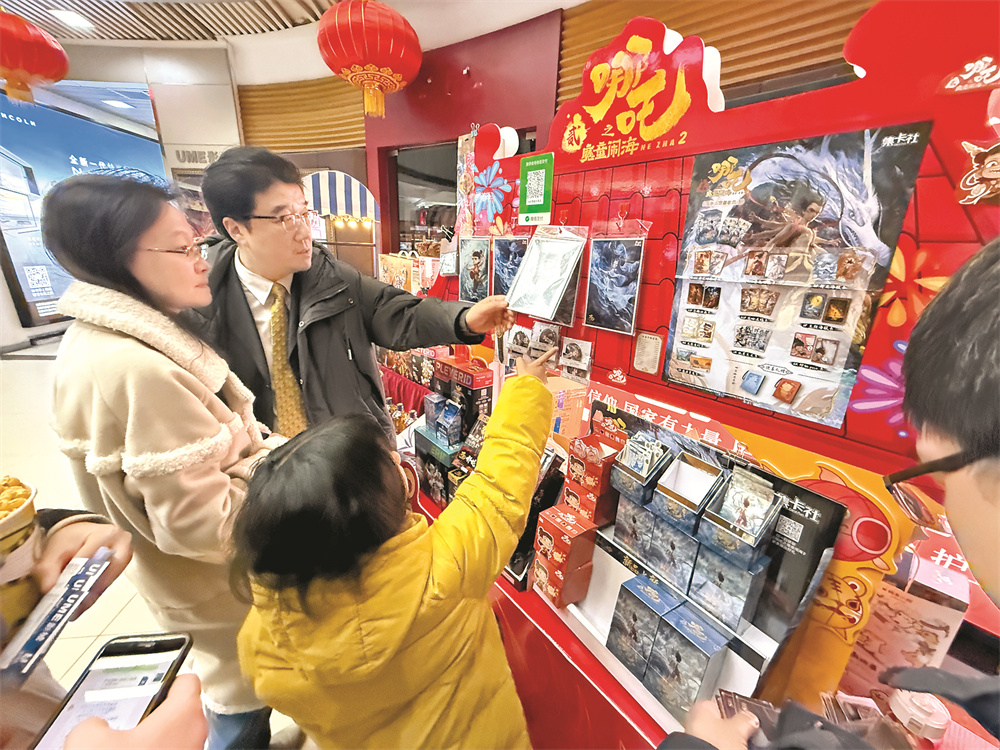 2月14日晚,在北京市海淀区的UME国际影城(华星店),家长带着孩子挑选电影纪念品。新华社记者 才 扬 摄