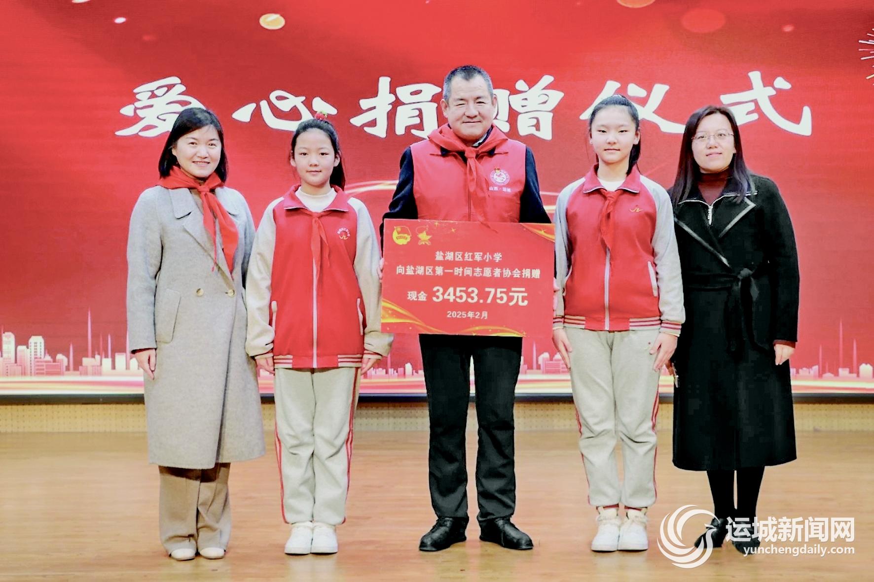 运城晚报讯(记者 杜磊)2月19日,在共青团盐湖区委的支持下,盐湖区红军小学将义卖款项3453.75元捐赠给盐湖区第一时间志愿者协会,用于公益事业。