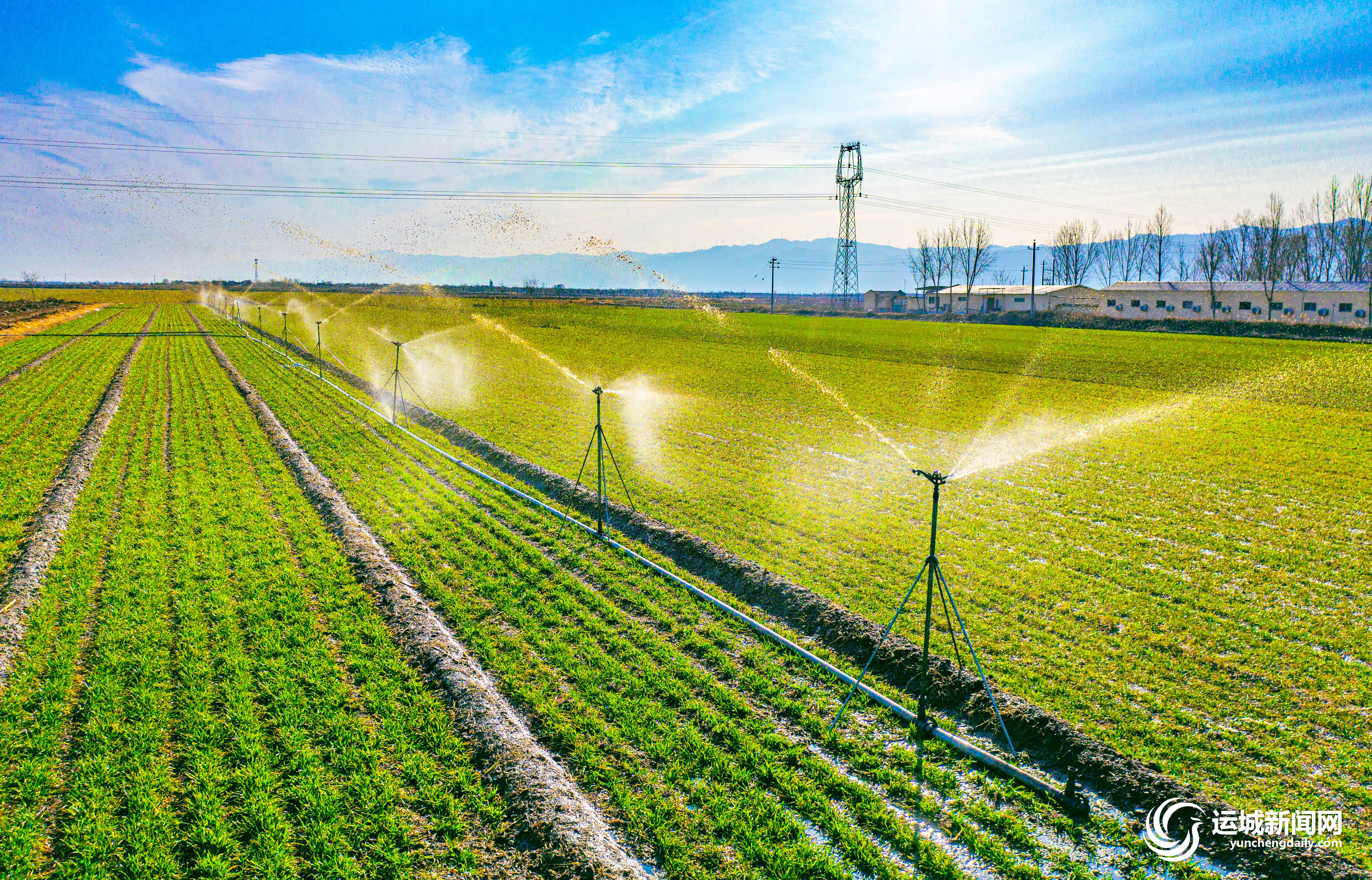 2月23日,永济市卿头镇曾家营村村民紧抓农时,使用绞盘式节水设备对小麦进行喷灌,为夏粮增产丰收打好基础。