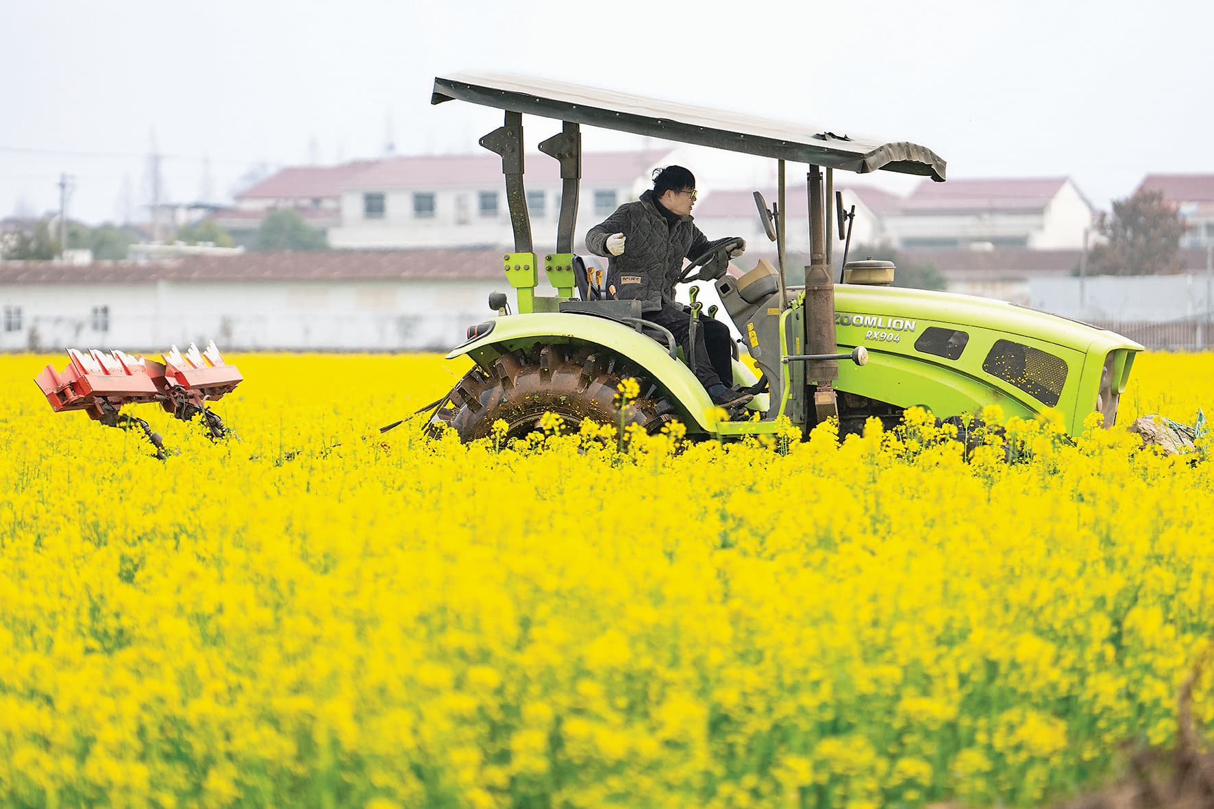 2月25日,在沅江市草尾镇乐园村,村民操作旋耕机翻耕芥兰绿肥。