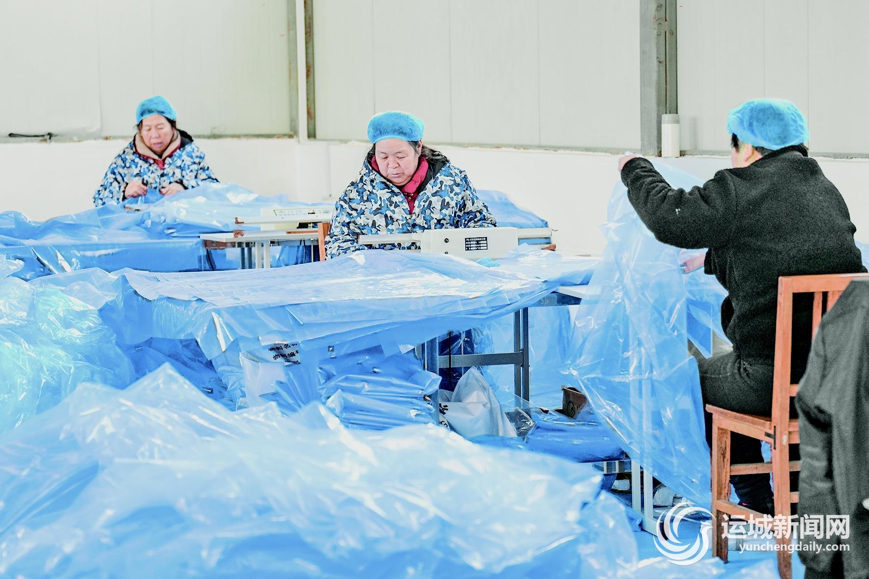 走进坪坡村就业帮扶车间,20名工人各自坐在一台像缝纫机似的机器前,熟练地操控着机器,她们的身边堆放着一摞摞蓝色塑料薄膜。只见她们把两张膜边对齐后,小心地放在机器下,随着双脚踩下机器下方的按键,两张膜边就黏合在了一起。