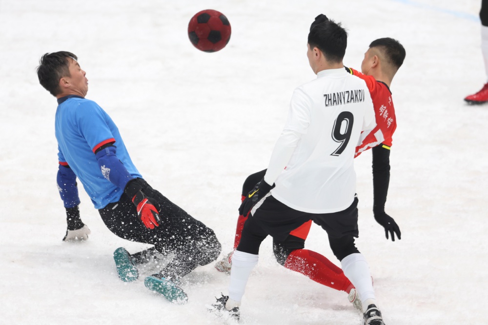 3月1日,中国顺佳足球队球员胡斯楞(右)在比赛中射门。当日,2025年上海合作组织雪地足球赛在哈尔滨开赛。中国顺佳足球队2比1战胜吉尔吉斯斯坦雪豹足球队。