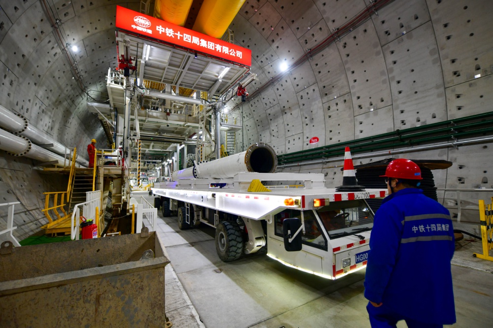 3月4日,中铁十四局建设者在济南市黄岗路穿黄隧道内施工作业。