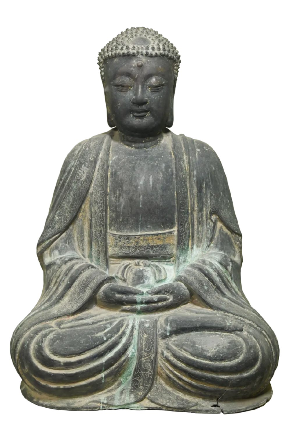 佛像结跏趺坐,双手施禅定印,这是佛教修行者进入禅定状态的姿势。结跏趺坐有助于修行者集中精神,排除杂念,达到内心的平静与安宁。双手施禅定印,姿态自然而优雅,仿佛在默默传递着佛法的智慧与力量。佛像面容丰满,似在俯瞰世间万物,又似在为众生的苦难而慈悲;体态自然,展现出一种和谐统一的美感,仿佛不是铜铸之物,而是一位真正的修行者在禅定之中。