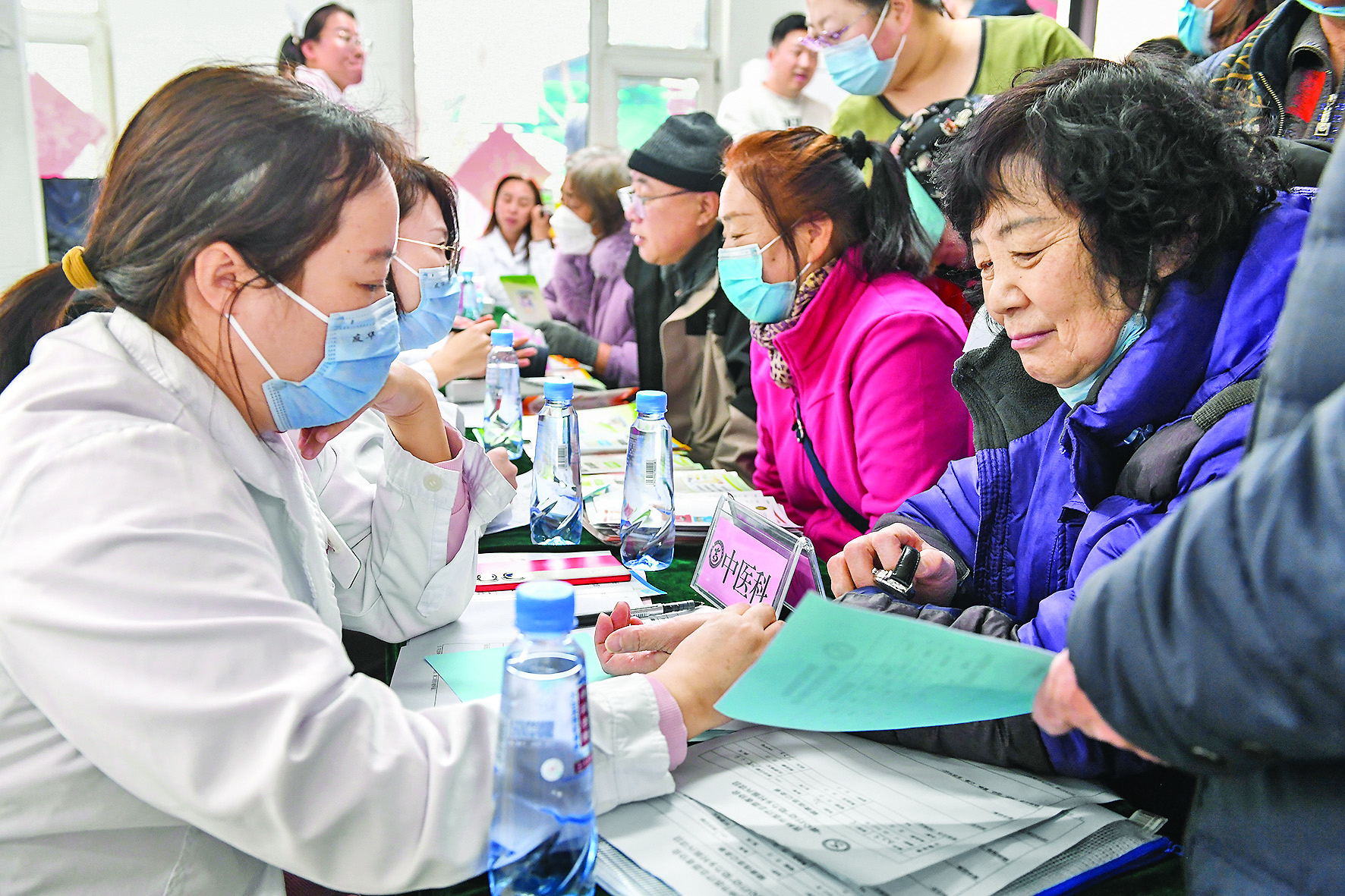 3月4日,在吉林省吉林市田园社区,吉林市医疗志愿者协会志愿者为居民检查身体。