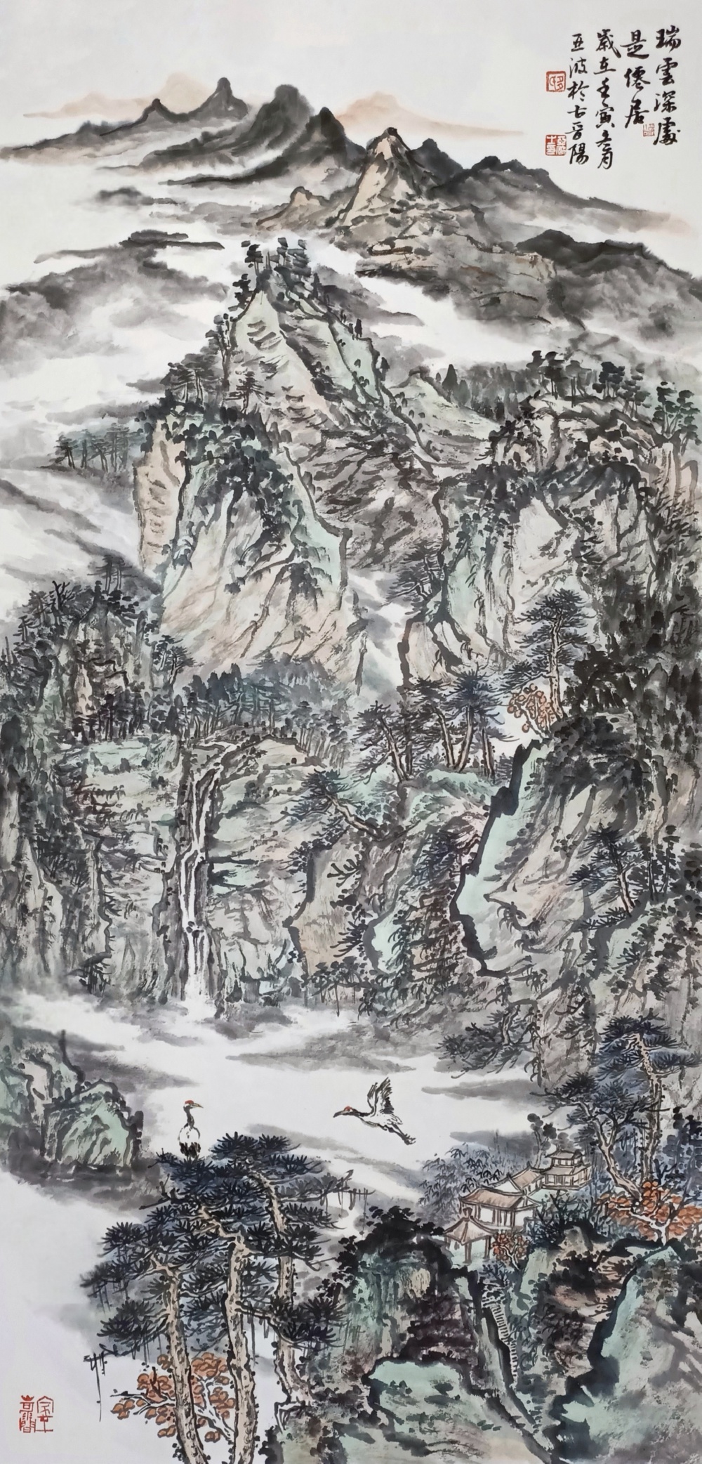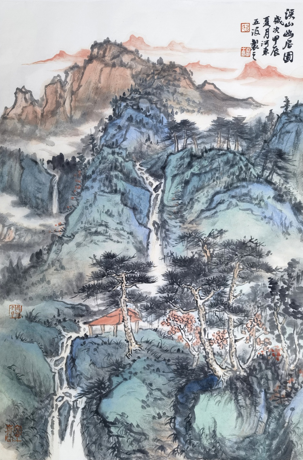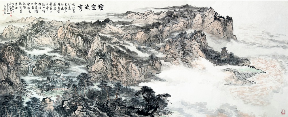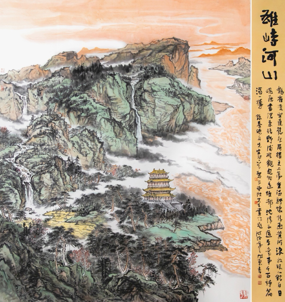 且看《雄峙河山》。这幅气势磅礴的青绿山水画,突破常见的程式化表达,前景虬松笔墨洒脱,画眼位置的鹳雀楼熠熠生辉,主景条山与环抱的黄河遥相呼应,天空赋以朱磦,云蒸霞蔚,气象万千。在创作过程中,多亚波运用矿物颜料与植物颜料的叠染技法,使青绿之色既显唐韵遗风,又具时代新意。特别是,他还邀请书法家原旭东题写诗家秦晓舟诗作,整幅作品呈现出诗书画印的厚重味道。