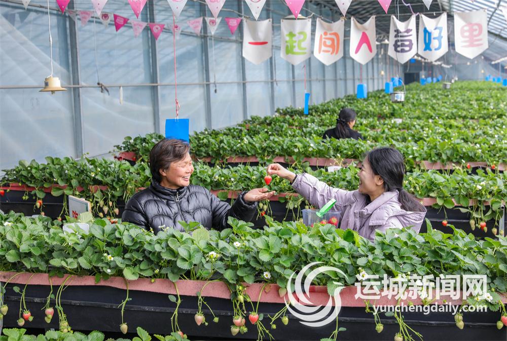 在郑桂兰的一旁,几名游客正在品尝该大棚里的草莓。“这个草莓好甜啊,颜色也很好看。”闻喜县桐城镇李女士带着女儿一起前来采摘,在“一起闯入莓好里”条幅的映衬下,她们的笑容显得格外甜美。