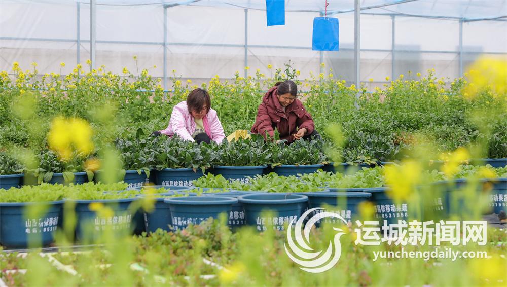 在夏县德兰农场移动果蔬设施大棚内,工作人员在修整盆栽。