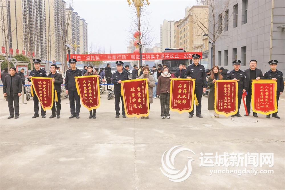 3月5日下午,盐湖公安分局院内人声鼎沸,一场以“破案有力,挽损暖心”为主题的赃物赃款集中返还仪式在此举行。31辆电动自行车、108.5万元现金整齐陈列,受损群众代表从民警手中接过失而复得的财物,掌声与锦旗交织成最温暖的画面。