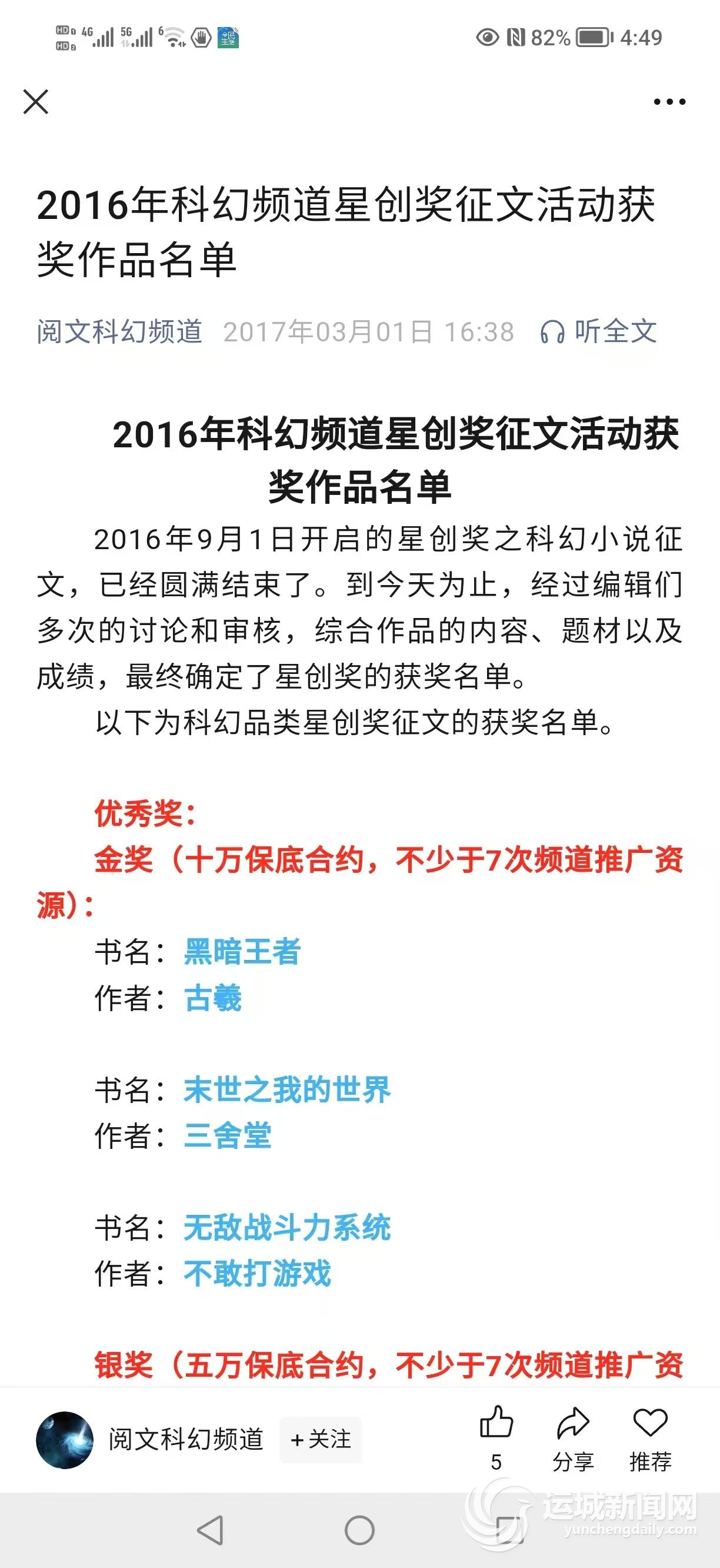 像哪吒一样,他东冲西突,以惊人的毅力与灵性,在网络文学创作上闯出了一条科幻网络小说写作之路。他的作品由起点中文网等大型门户网站推荐,在阅读排行榜上名列前茅。他在虚拟的网络文学世界写出了运城文学的高光时刻。