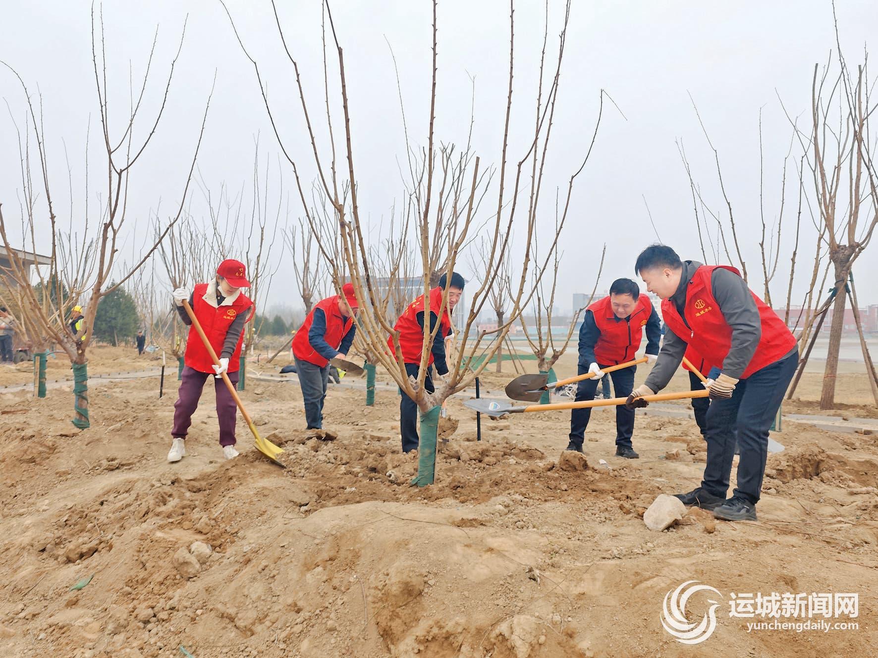 3月10日上午,运城市水务局80余名干部职工与官道河生态修复与整治工程项目部施工人员,在我市中心城区舜风公园东片区域共同植树添绿。