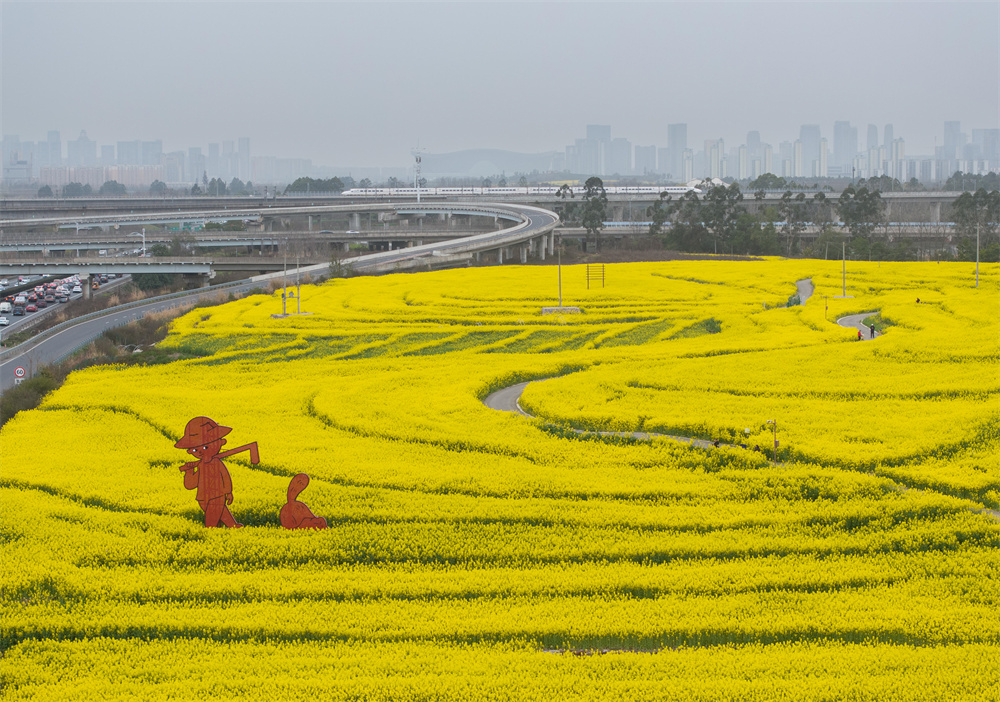 成都市锦江区三圣街道的油菜花田(3月12日摄,无人机照片)。春回大地,成都市环城生态区的油菜花陆续进入盛花期。