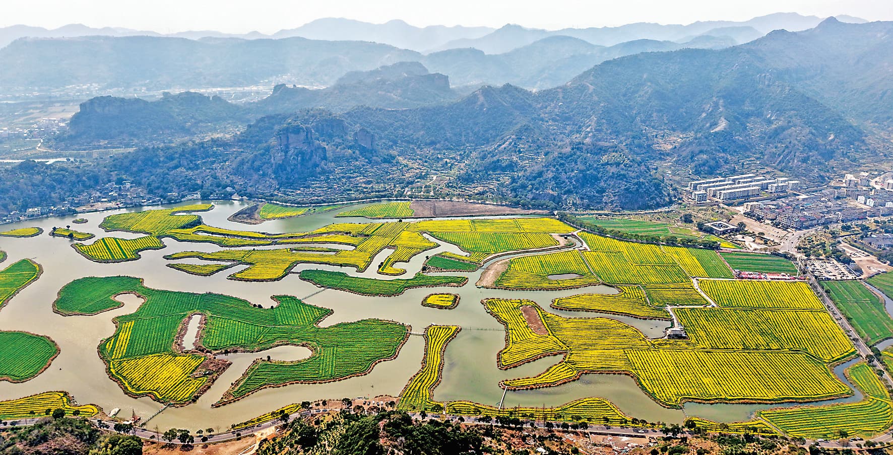 3月12日,在浙江省临海市桃渚镇桃江十三渚的田野上,油菜花竞相开放。 新华社发(王华斌 摄)