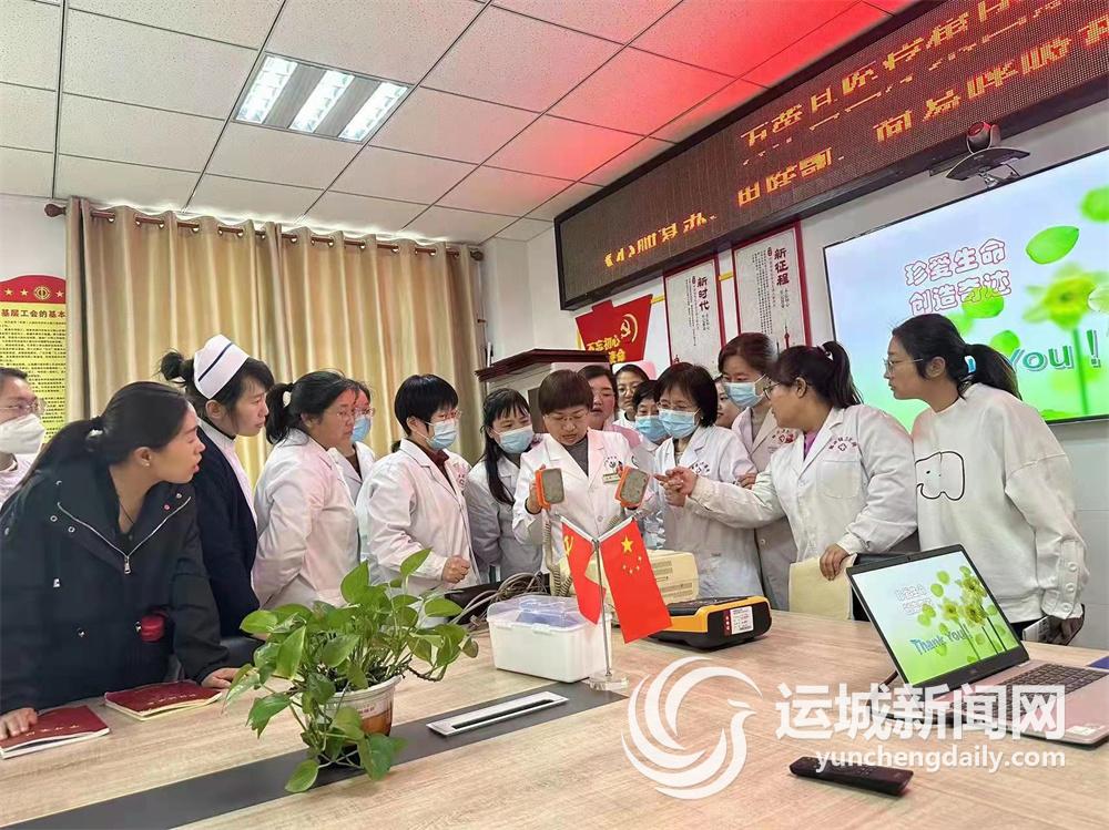 老年病科的女医务人员在王琛主任带领下学习使用急救设备。 (资料照片)