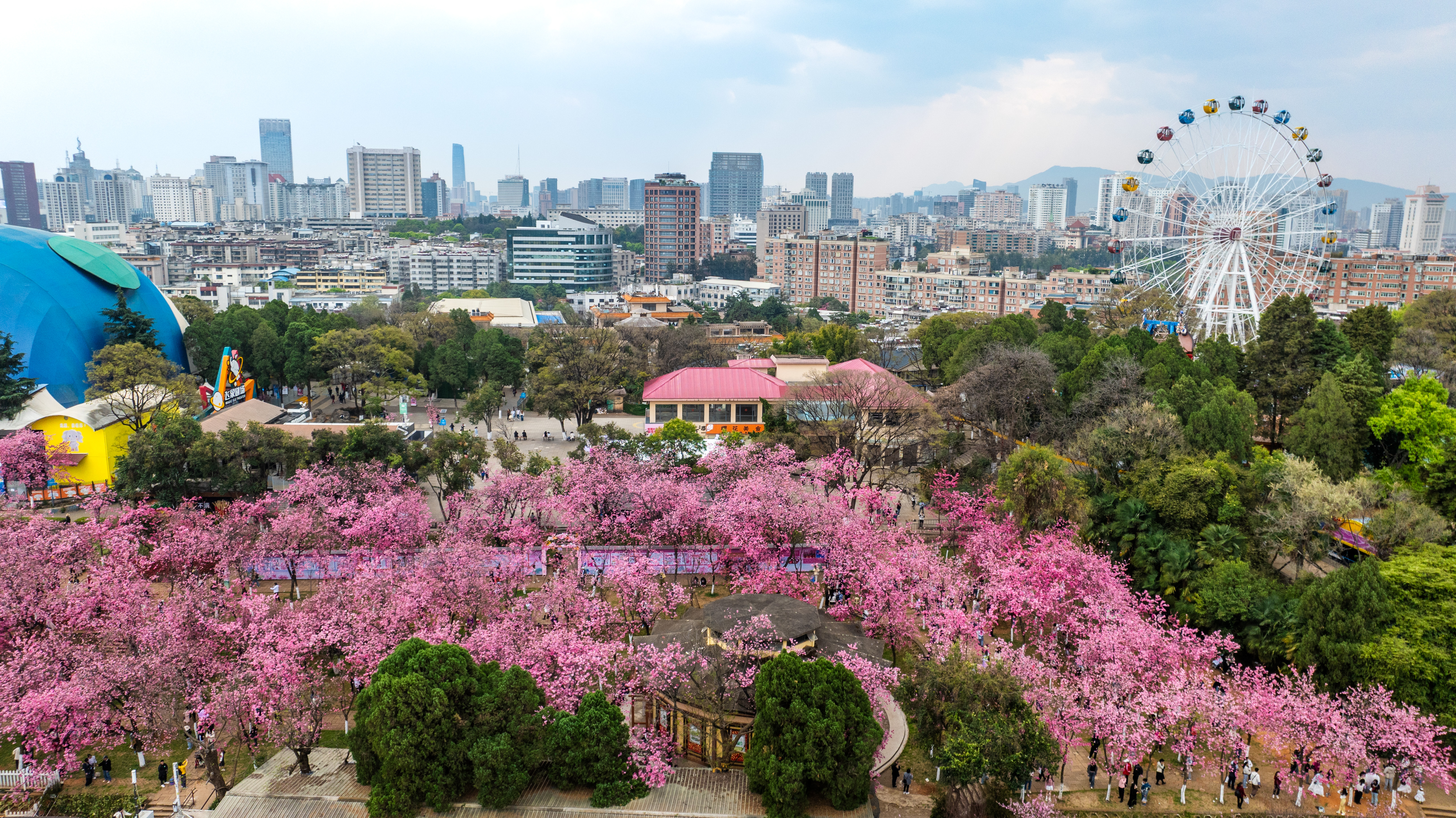 昆明圆通山公园里盛开的樱花(无人机照片,3月14日摄)。