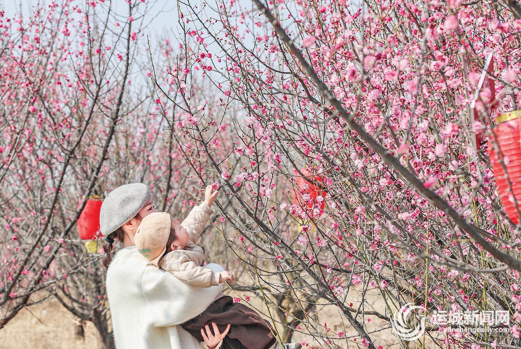 近日,盐湖区上郭乡中陈村北侧凤凰岭上,游客在梅园中踏春赏景。