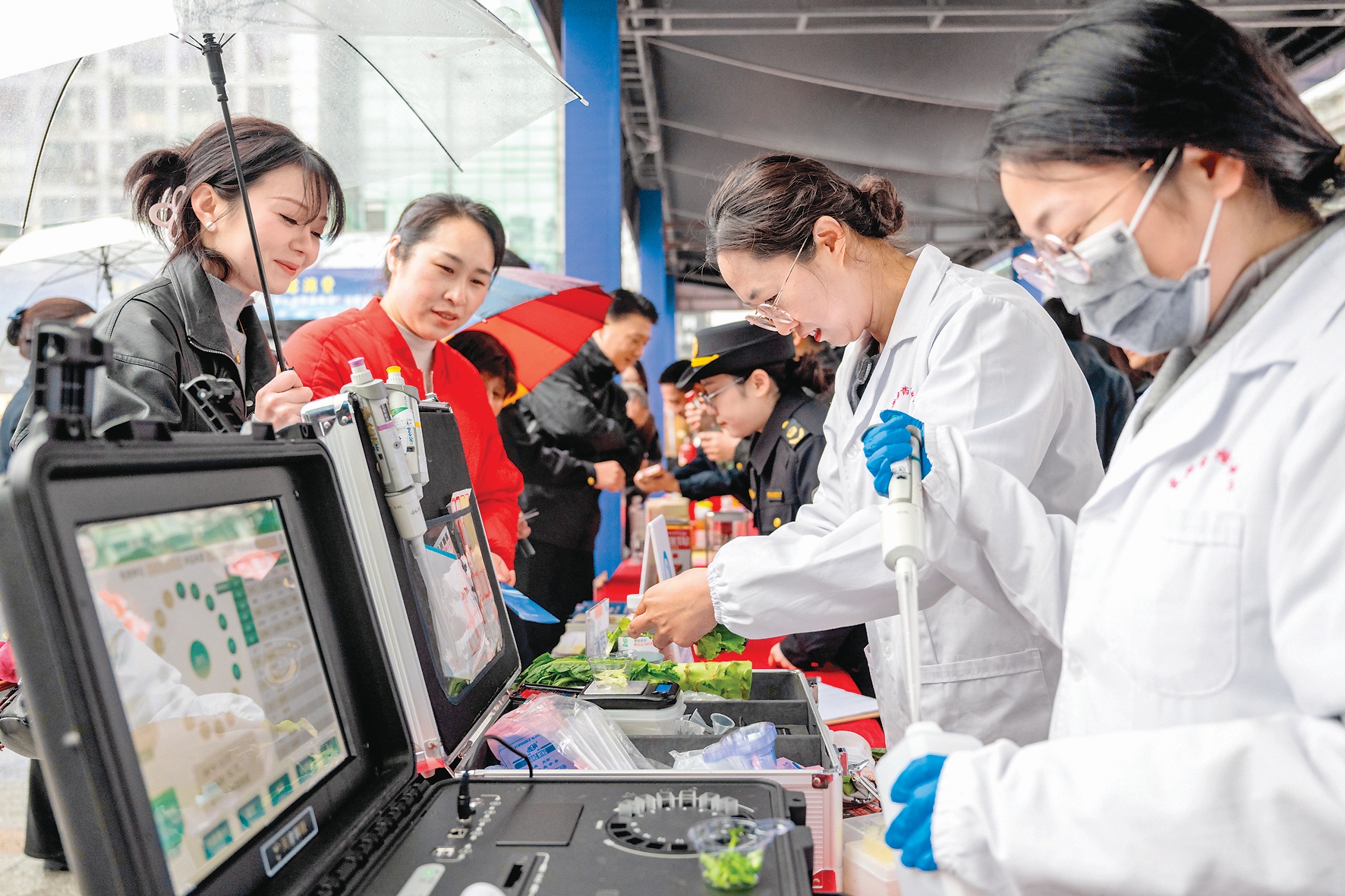3月15日,在浙江省湖州市长兴县放心消费嘉年华公益活动现场,该县食品药品检验检测中心工作人员为市民提供免费果蔬检测服务。