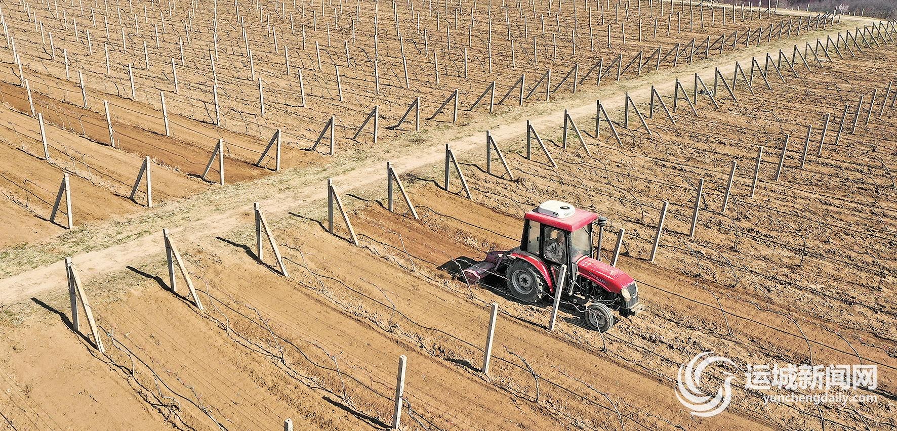 3月20日,山西格瑞特酒庄有限公司工人驾驶农机在葡萄园区进行旋耕松土作业。