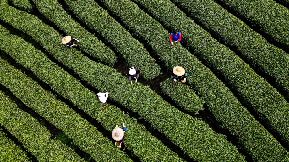 三江侗族自治县同乐苗族乡寨大村的茶农在山上采茶(3月21日摄,无人机照片)。