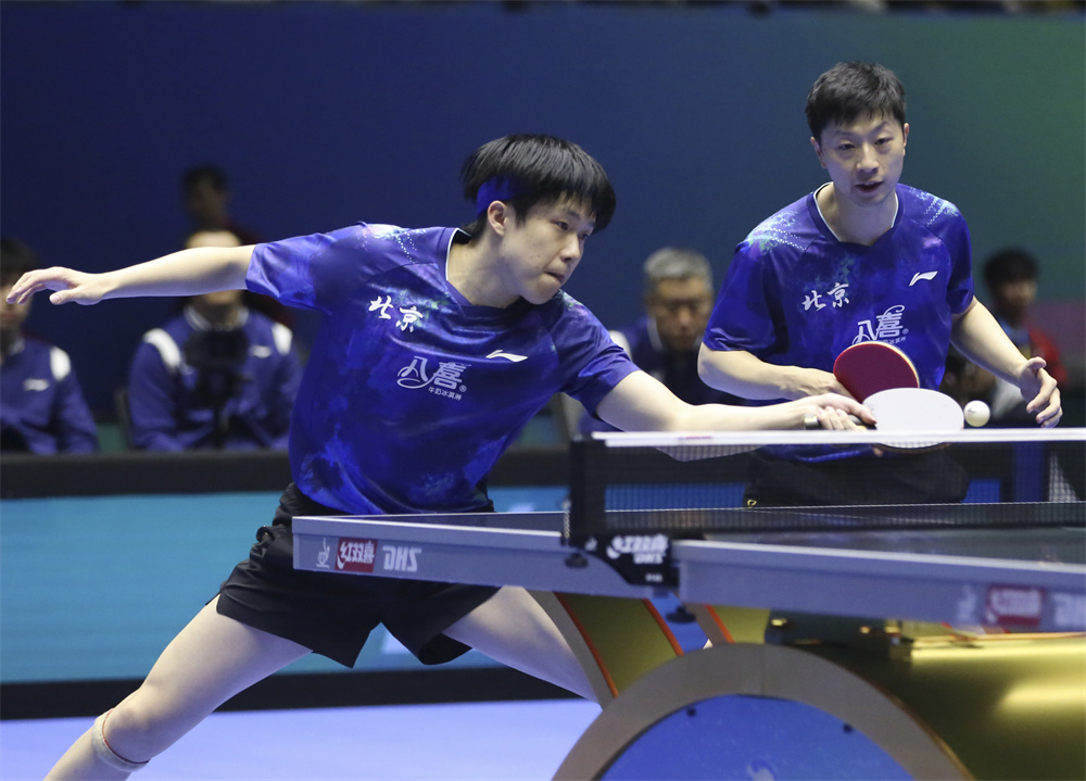 北京八喜队组合马龙/王楚钦(左)在比赛中。他们3比0战胜辽宁队组合杨硕/袁励岑。