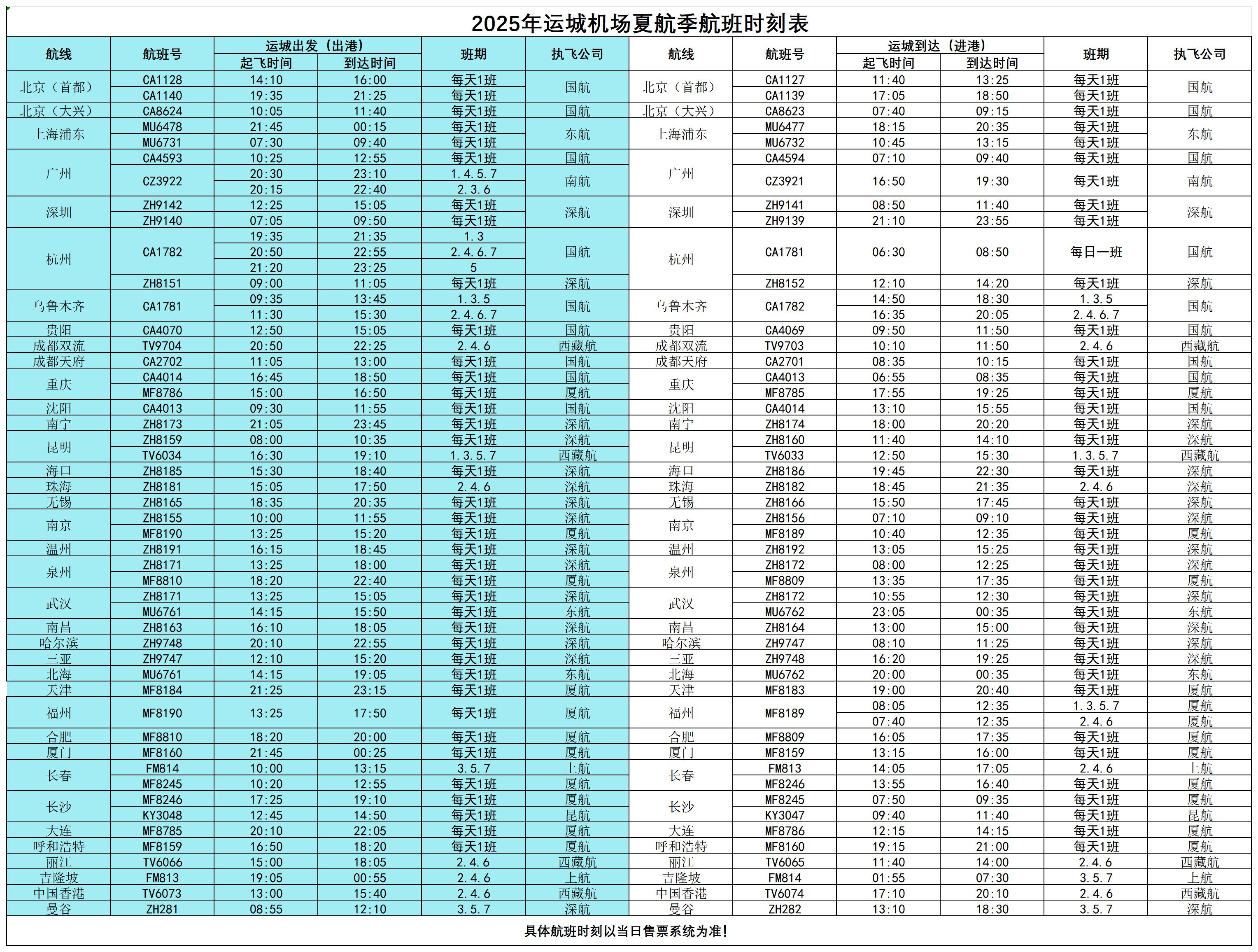 运城晚报讯(记者 薛俊)3月27日,记者从运城盐湖国际机场获悉,机场将进行换季,换季时间从3月30日开始到10月25日结束,共210天。换季后将执行2025年夏航季航班计划。