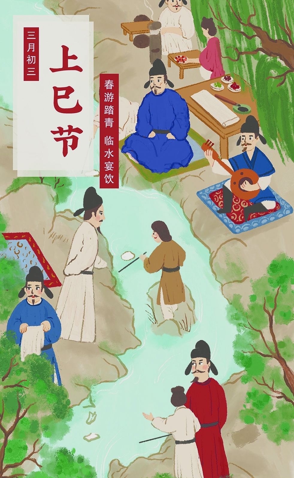 经过数百年的发展,到唐代,在相对安定、宽松自由的社会环境中,上巳节达至其生命的鼎盛,成为官民最看重的节日之一,堪称春天的狂欢节。