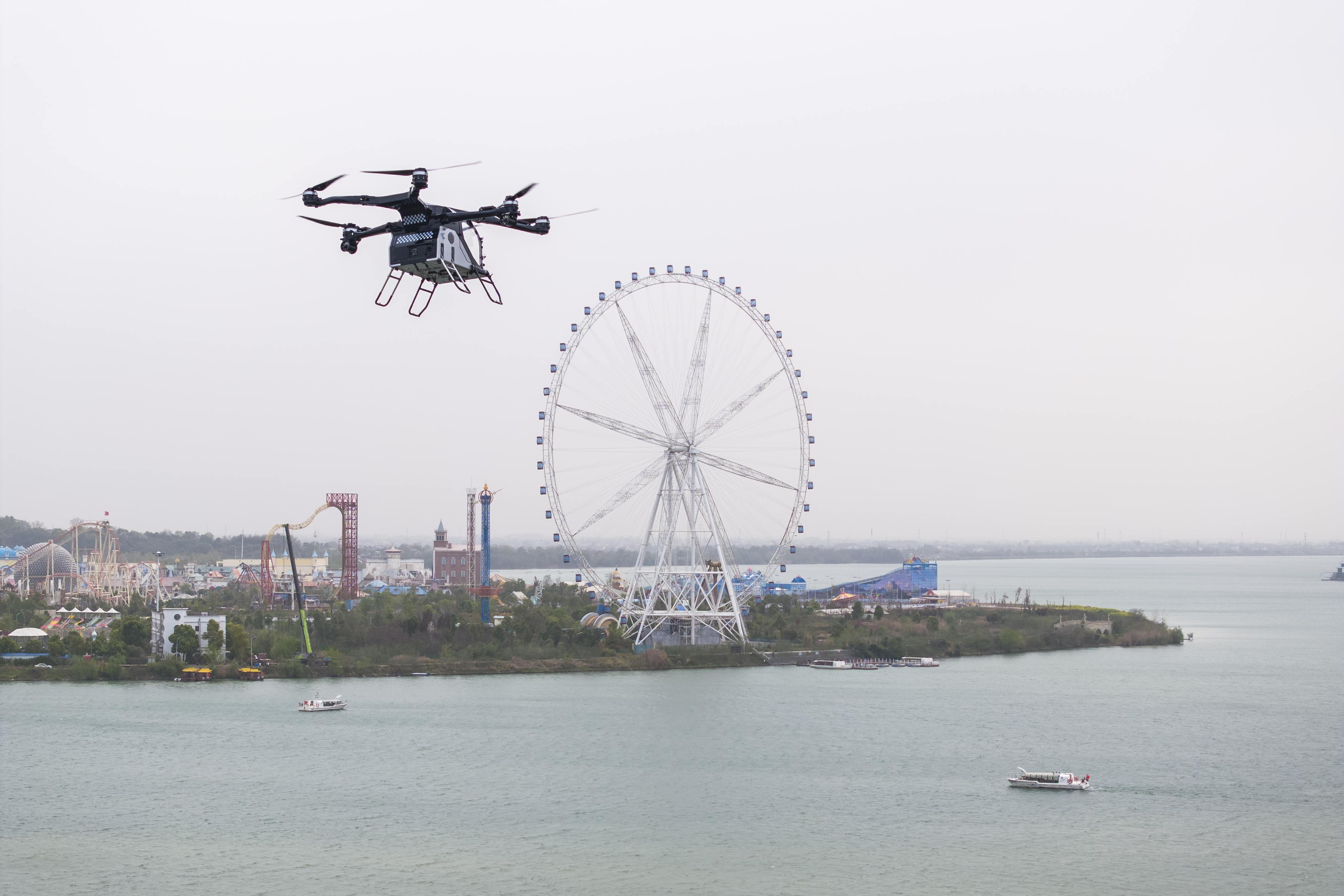 3月27日,小鹏汇天“陆地航母”飞行汽车飞行体在常德柳叶湖旅游度假区进行飞行演示(无人机照片)。
