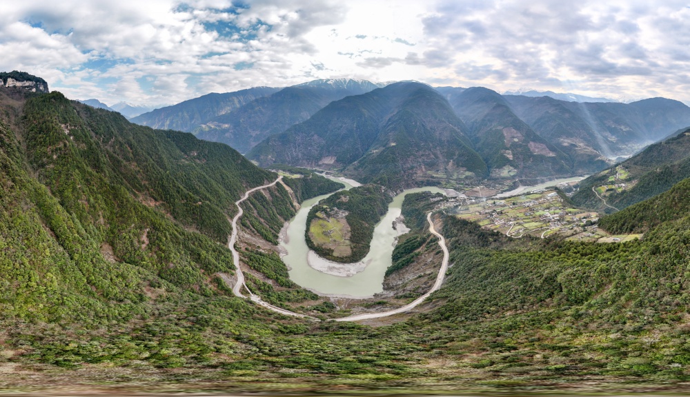 3月28日在云南怒江州贡山县丙中洛镇拍摄的怒江第一弯(无人机全景照片)。