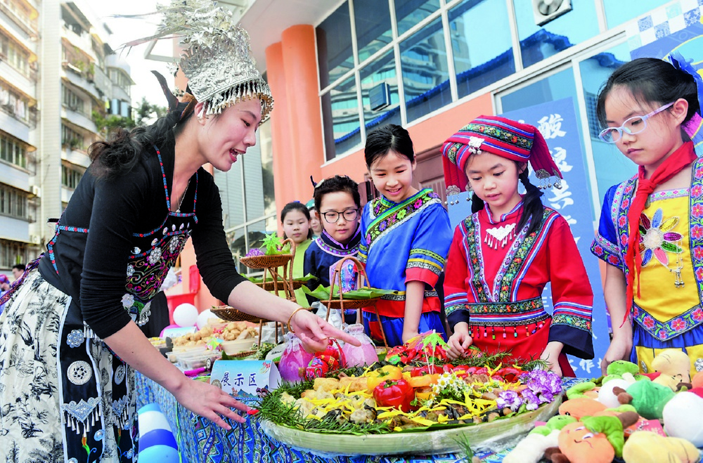 3月27日,在南宁市滨湖路小学,老师和学生共同展示美食。