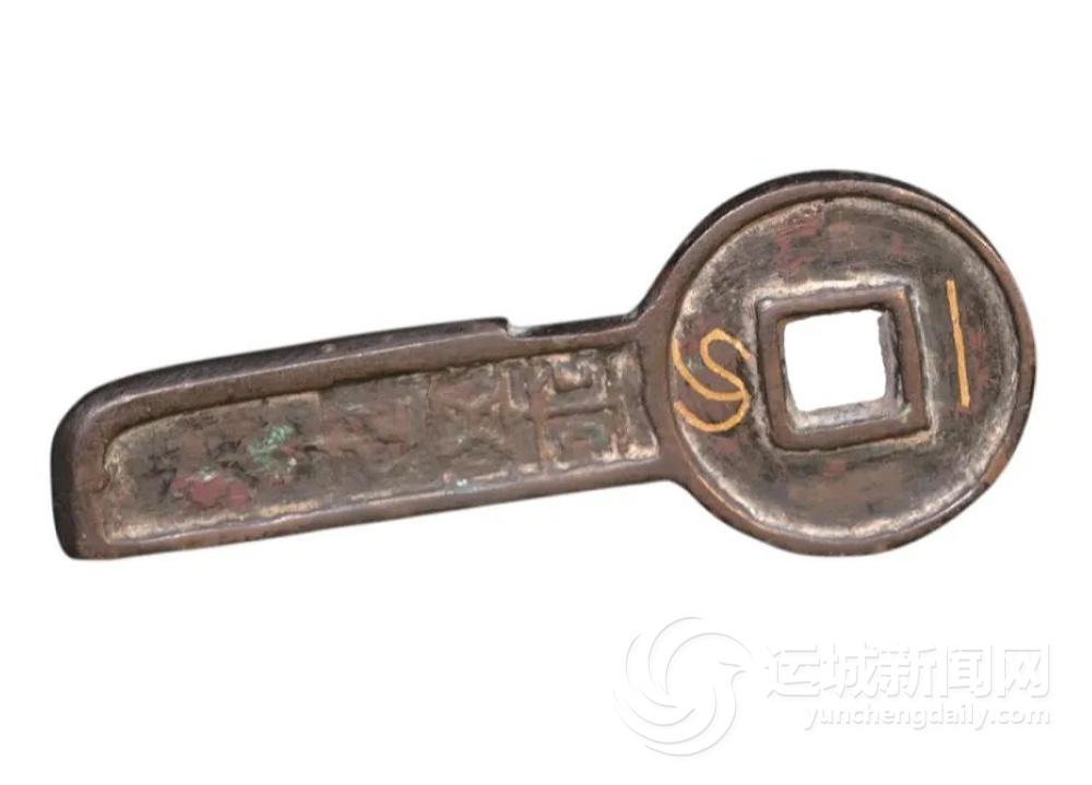 “一刀平五千”俗称“错刀”或“金错刀”。盐湖区博物馆馆藏的这枚“金错刀”长为7.4厘米,宽为2.9厘米,整体为钥匙形,由青铜铸成。货币上部为“环柄”,其上为阴刻的“一”“刀”两个篆体字,下部则为“刀身”,其上铸有阳文的“平五千”的字样。值得一提的是,其上部的“一”“刀”二字采用了特殊的镶嵌工艺——“错金工艺”,即在字的凹陷处填以黄金,并加以打磨,使字面与钱币表面保持平齐,因此它也被称为“金错刀”。