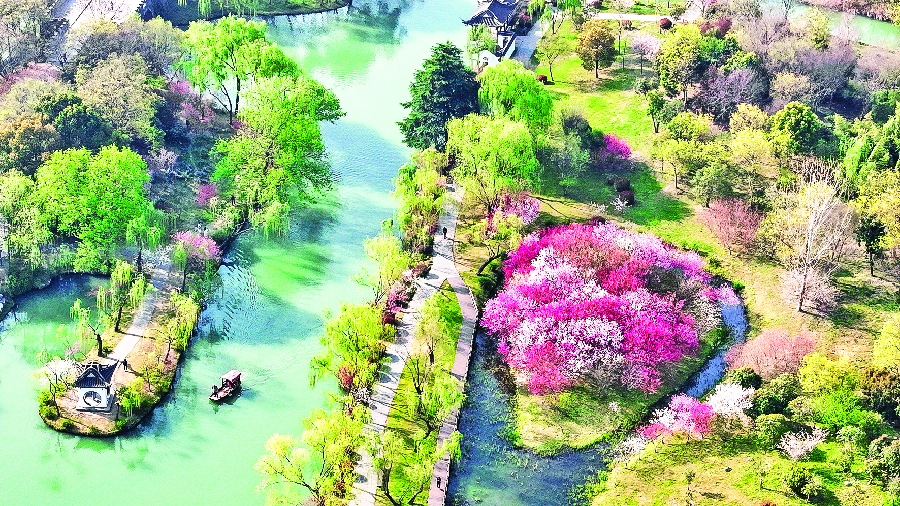 4月2日,游人在江苏扬州瘦西湖风景区踏春赏景。 新华社发(齐立广 摄)