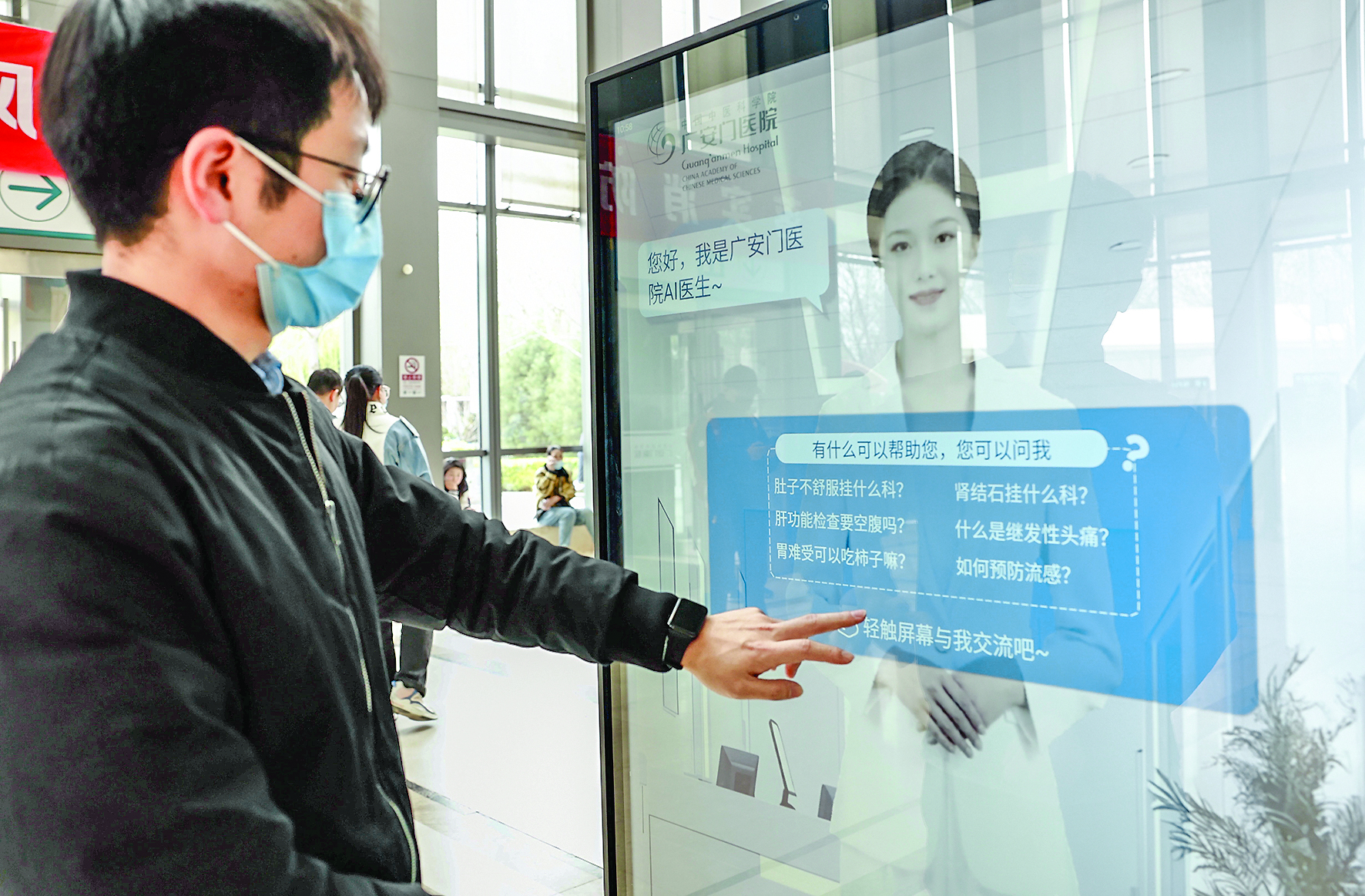 3月28日,患者在广安门医院门诊大厅体验AI导诊服务。