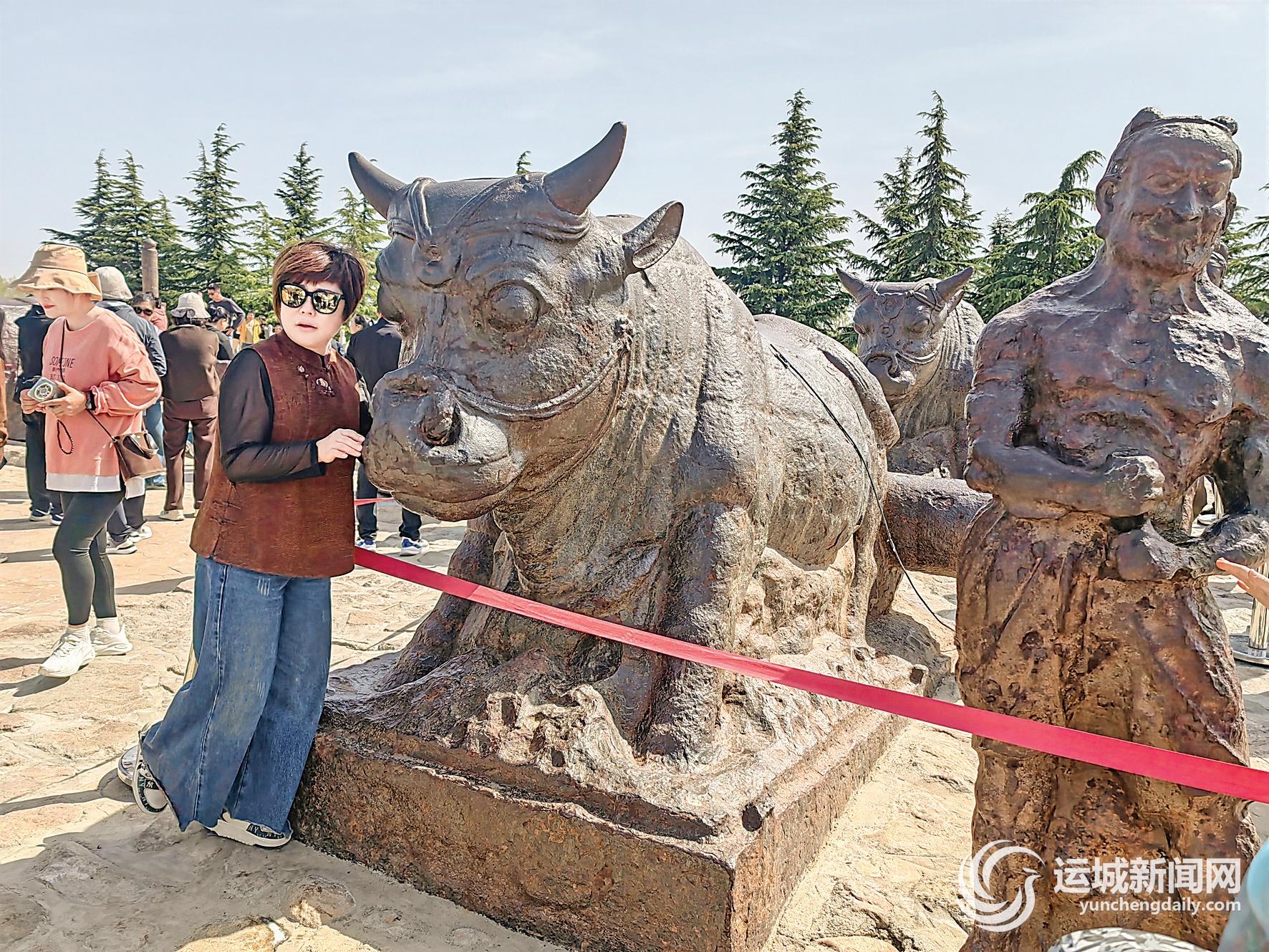 4月5日,在永济市蒲津渡遗址博物馆,游客同黄河大铁牛合影留念。