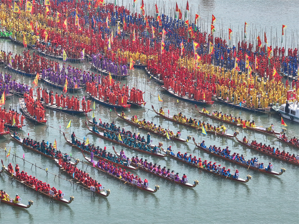 当日,2025泰州姜堰溱潼会船在江苏省泰州市姜堰区溱湖国家湿地公园开幕,五百多条各式船只和上万名会船选手飞篙走桨、弄潮击浪,演绎历久弥新的民俗画卷。