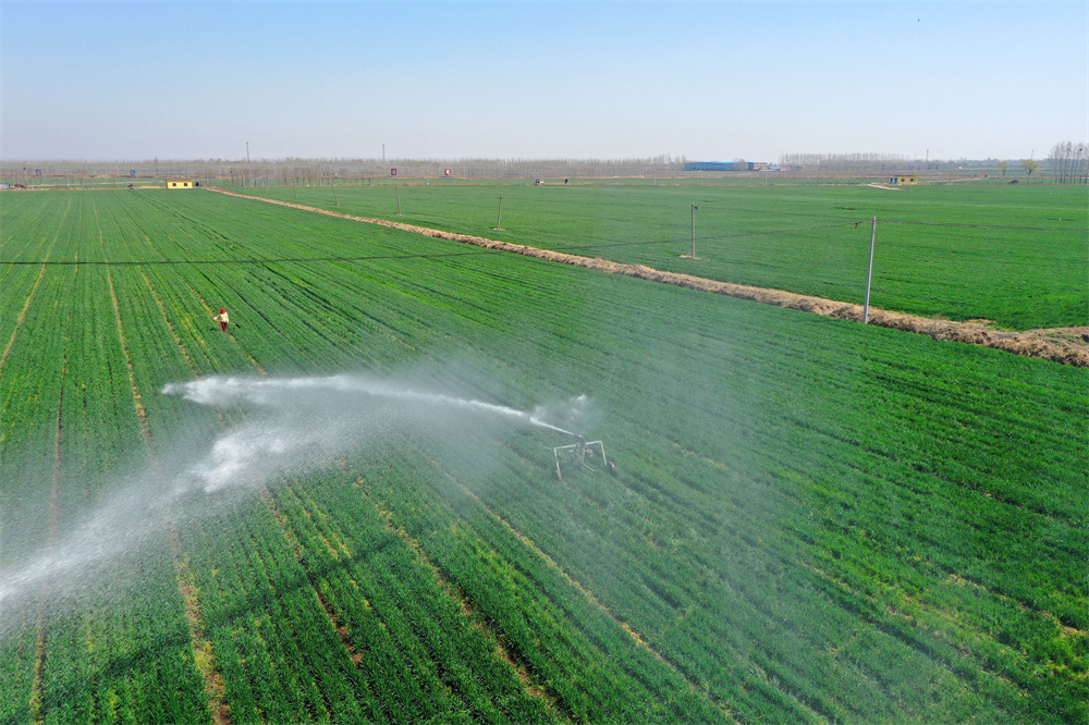 4月6日,在山东省青岛市即墨区瓦戈庄村绿色增粮先行示范区,农民采用卷盘式喷灌设备为小麦浇水。眼下,正是小麦拔节管理的关键期,在即墨区的田间地头,农民们抢抓农时,对小麦进行节水灌溉和高效管理,为夏粮增产丰收打下基础。