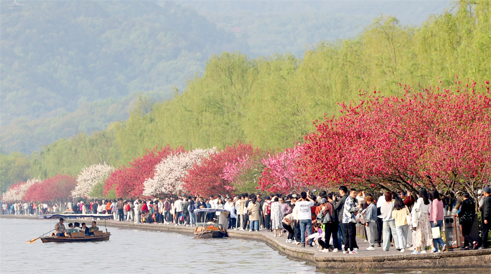 4月5日,在浙江省杭州市,西湖景区美不胜收,游人如织。 新华社发(周方玲 摄)