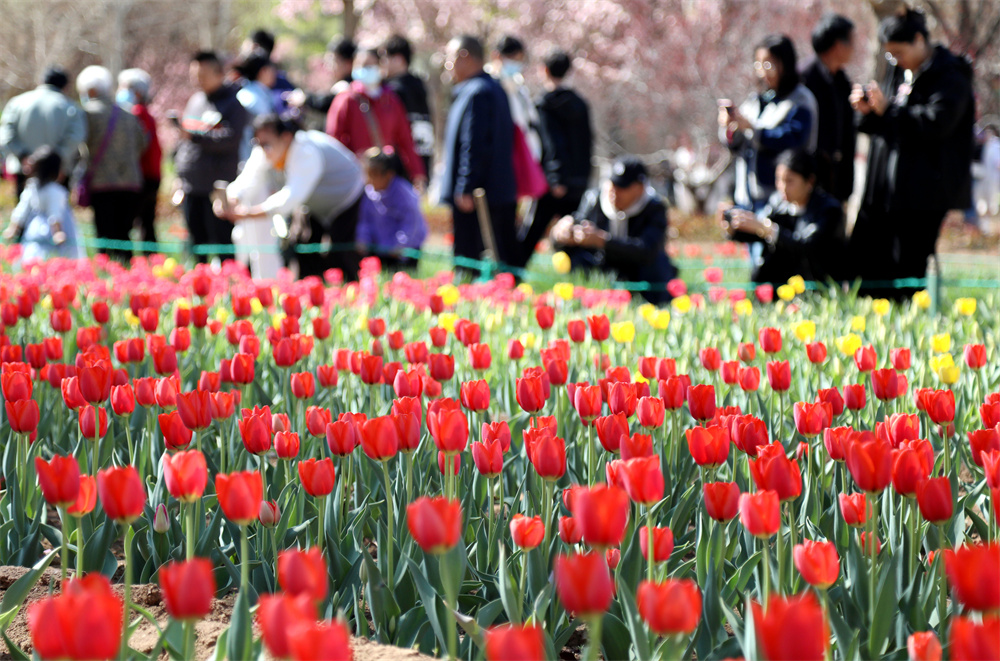 4月5日,游客在河北省沧州名人植物园内游览赏景。 新华社发(周 洋 摄)