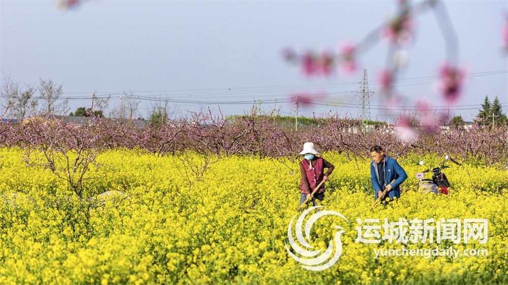 4月6日,平陆县部官镇计都村村民在对油菜地进行除草管护。