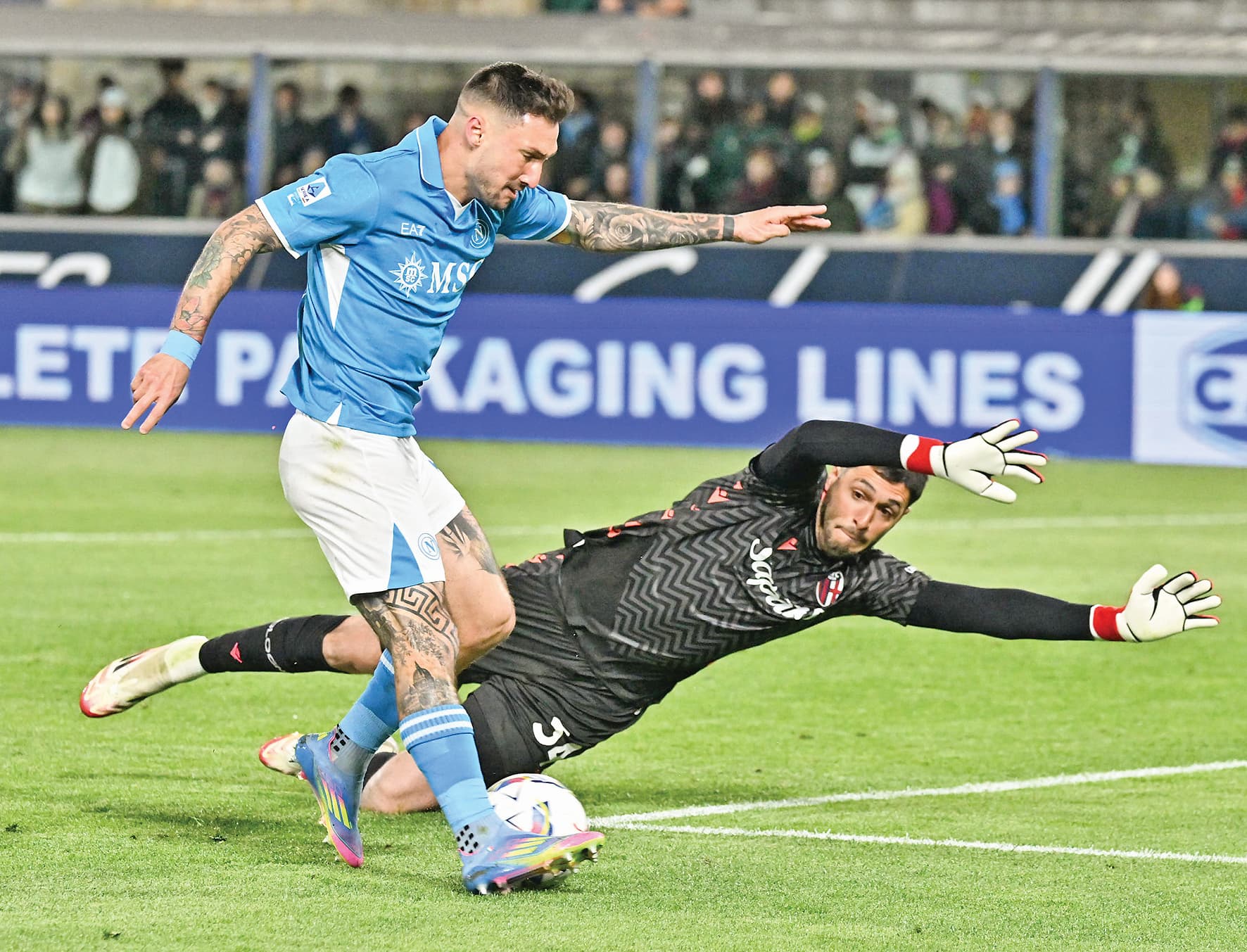 4月7日,博洛尼亚队守门员拉瓦吉亚(右)与那不勒斯队球员波利塔诺在比赛中拼抢。 当日,在2024~2025赛季意大利足球甲级联赛第31轮比赛中,博洛尼亚队主场1比1战平那不勒斯队。